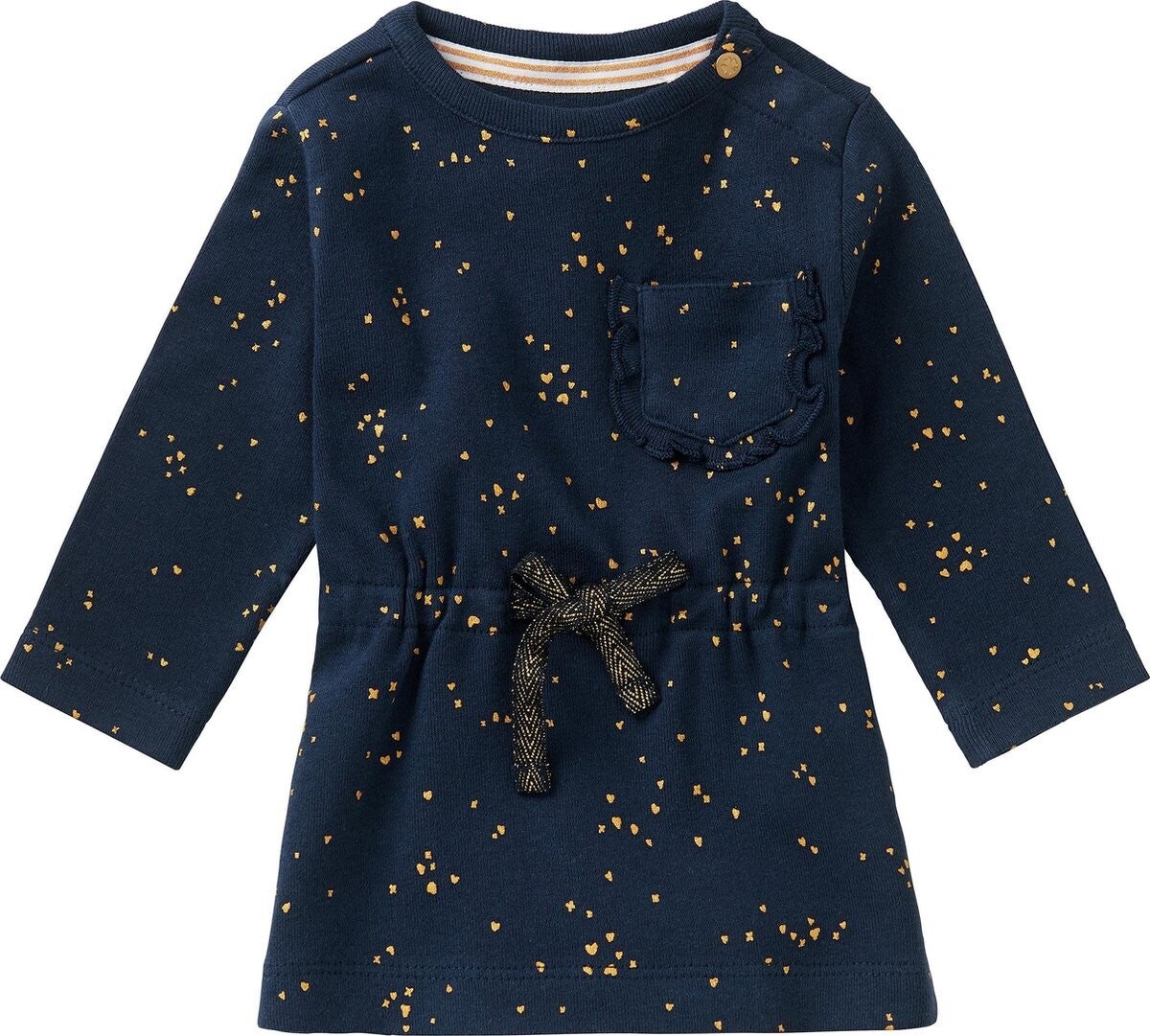 Een hartjesprintje doet het altijd goed. Dit blauwe meisjes jurkje heeft niet alleen een lief printje maar ook schattige details. Het zakje op de borst is versierd met ruches en in het striklint in de elastische taille zit gouddraad verwerkt. Het jurkje heeft lange mouwen en een kraagje met een handig drukknoopje om het aan- en uitkleden net even makkelijker te maken.