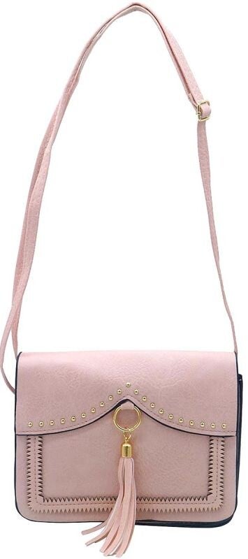 Met een rits en een magneet afsluitbaar. Heel speciaal zijn de details, zoals de dubbele kwastjes en de goudkleurige studs op de klep.