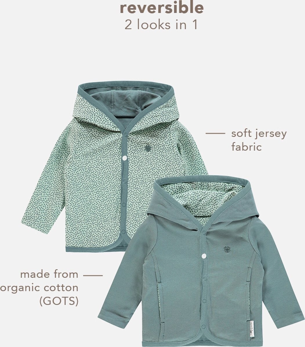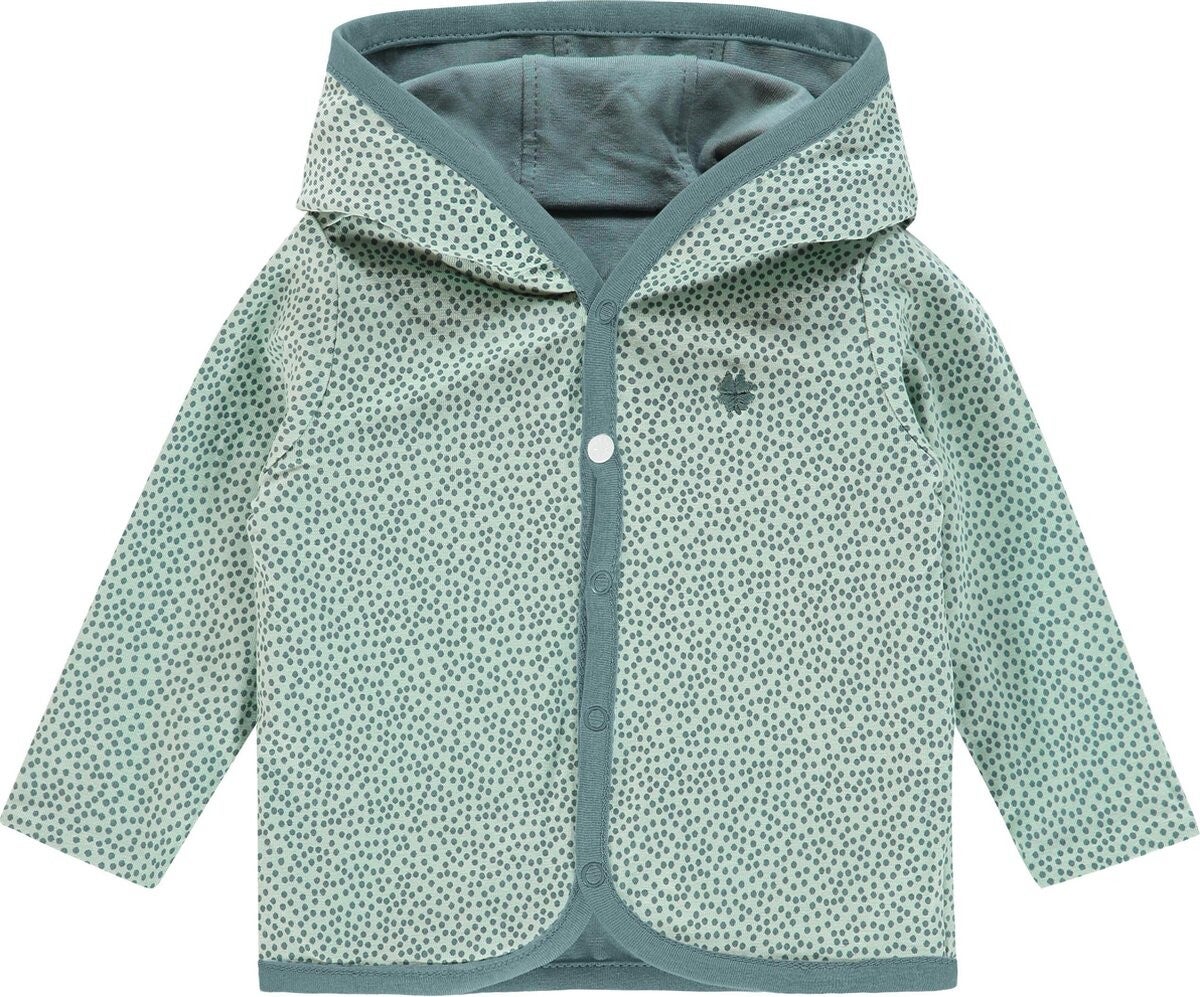 Leuk en veelzijdig vestje Haye van Noppies. Dit zachte ontwerp kan aan twee zijden gedragen worden en dat maakt het kledingstuk extra leuk. De binnenzijde is uitgevoerd in een all-over stippenprint en deze is zichtbaar bij de comfortabele capuchon. Ook de sluiting met drukknoopjes is uitgevoerd in dit contrast. Het kledingstukje is gemaakt van biologisch katoen, heeft twee steekzakjes en een klavertje vier, voor extra geluk. De kledingmaat is gelijk aan de lichaamslengte.