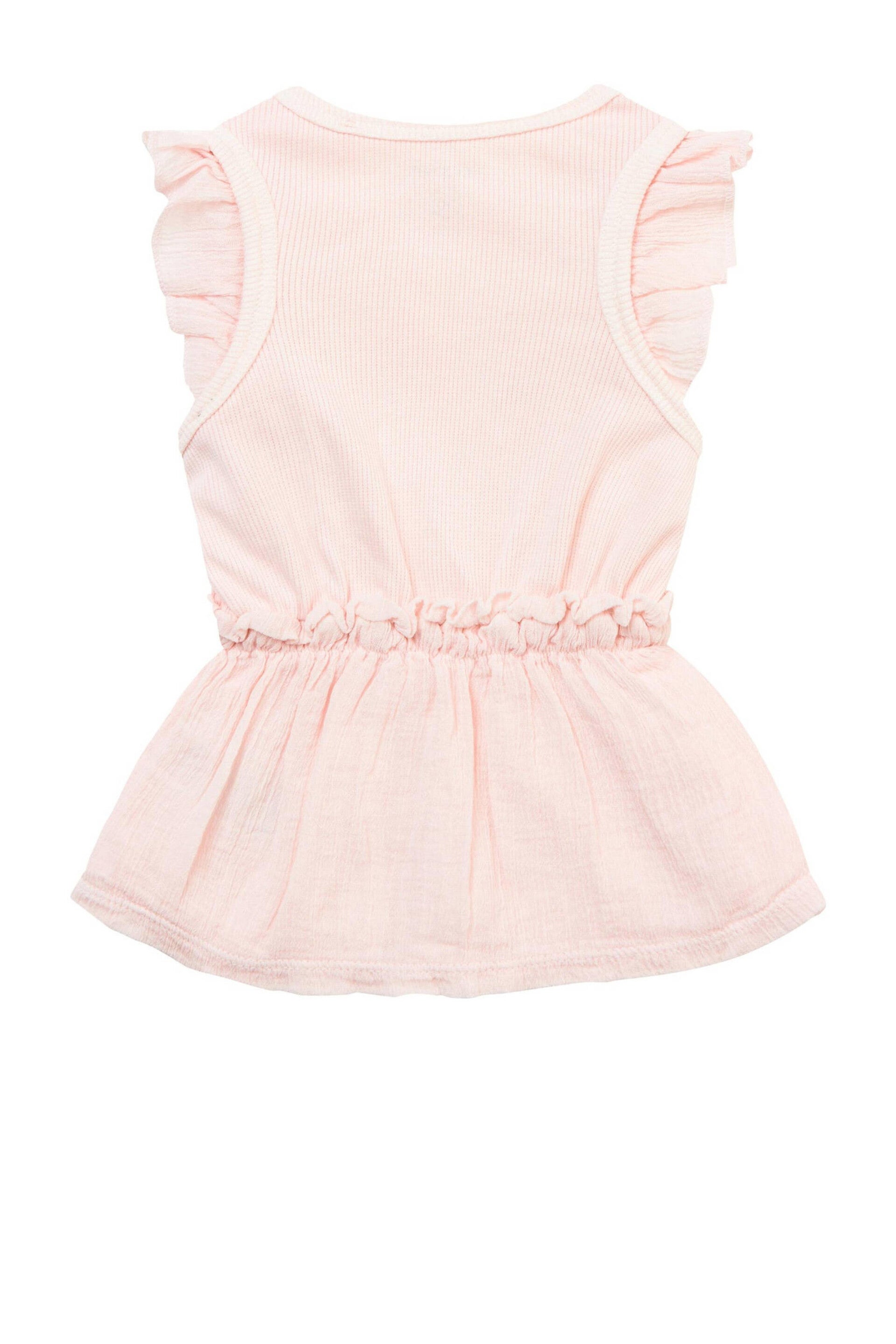 Deze meisjesjurk van Noppies is gemaakt van een stretchkatoen (duurzaam)mix. De jurk is mouwloos en heeft verder een ronde hals.