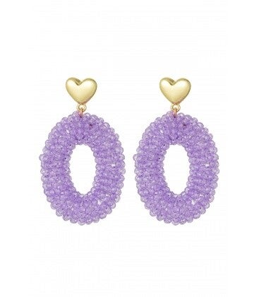Paarse glas kralen oorhangers met een goudkleurig hartje als oorstukje