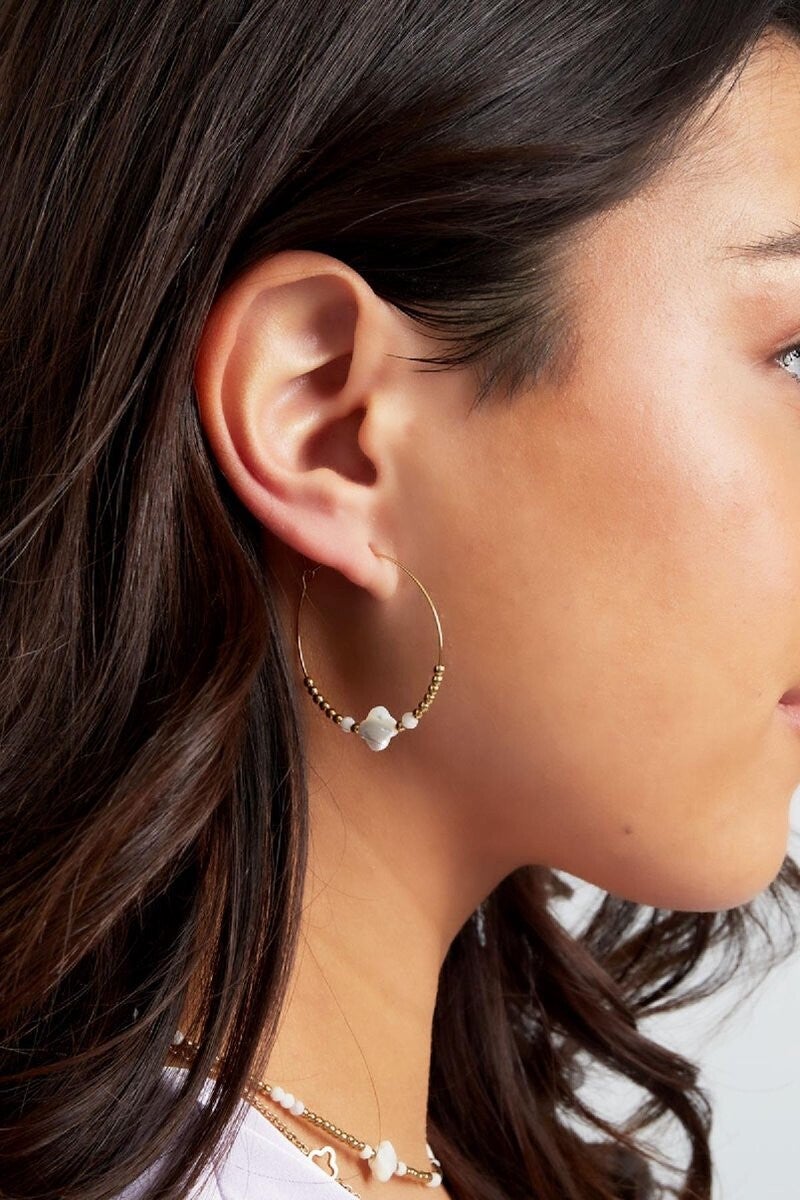Hoe leuk zijn deze gouden kralen oorbellen met leuke witte kraaltjes en klaver bedels. De oorbellen hebben een frisse uitstraling en zijn perfect voor aankomend seizoen; leuk om te combineren met meerdere sieraden met witte details. De oorbellen zijn gemaakt van stainless steel, hematiet, zeeschelp en white jade. De oorbellen hebben een afmeting van 3m5 cm, perfect!