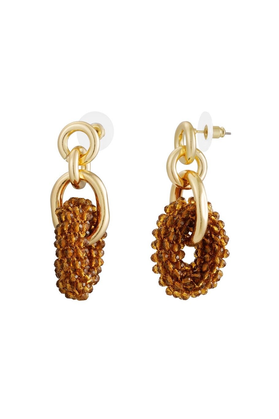 Bruine glas kralen oorhangers met goudkleurige ringen
