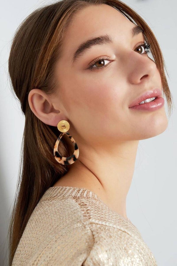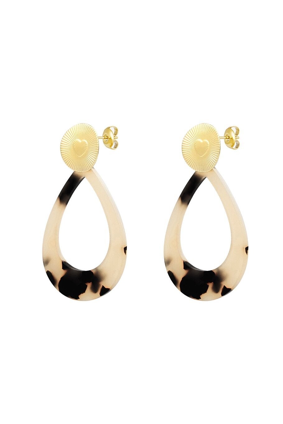 Wauw! Hoe leuk zijn deze gouden oorbellen in de vorm van een hart coin met beige geprinte ovalen details! De oorbellen zijn een echte musthave en zijn zowel leuk te dragen op een chique manier. Houd jij meer van een speelse look? Combineer dan deze oorbellen met meerdere matchende oorbellen! De oorbellen zijn gemaakt van stainless steel en sheet materiaal. De oorbellen hebben een afmeting van 6 cm