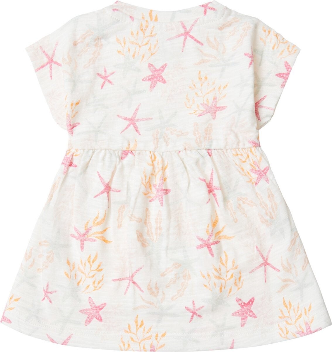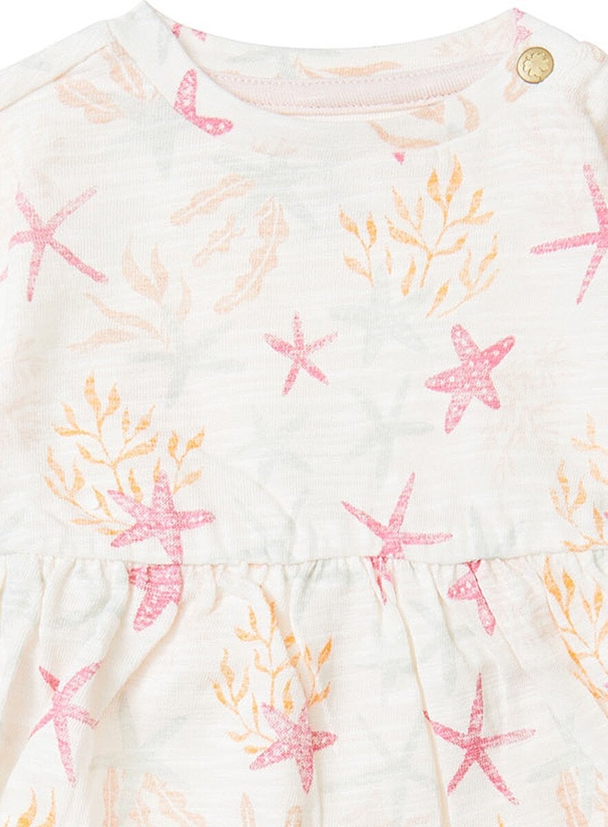 Daar is dat leuke zeesterrenprintje weer! Jurk Comstock van Noppies Baby heeft een allover printje en een elastische taille die zorgt voor extra comfort en een fijne pasvorm. Op de schouder zitten twee drukknoopjes die het verkleden en verschonen een stuk makkelijker maken. Dit keylook item uit de Noppies Baby collectie is een musthave voor de garderobe van jouw kleintje!