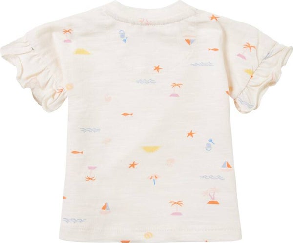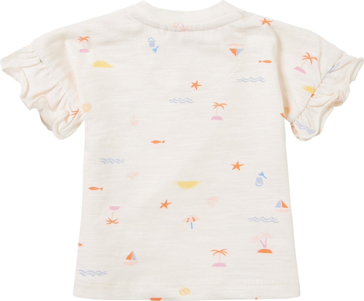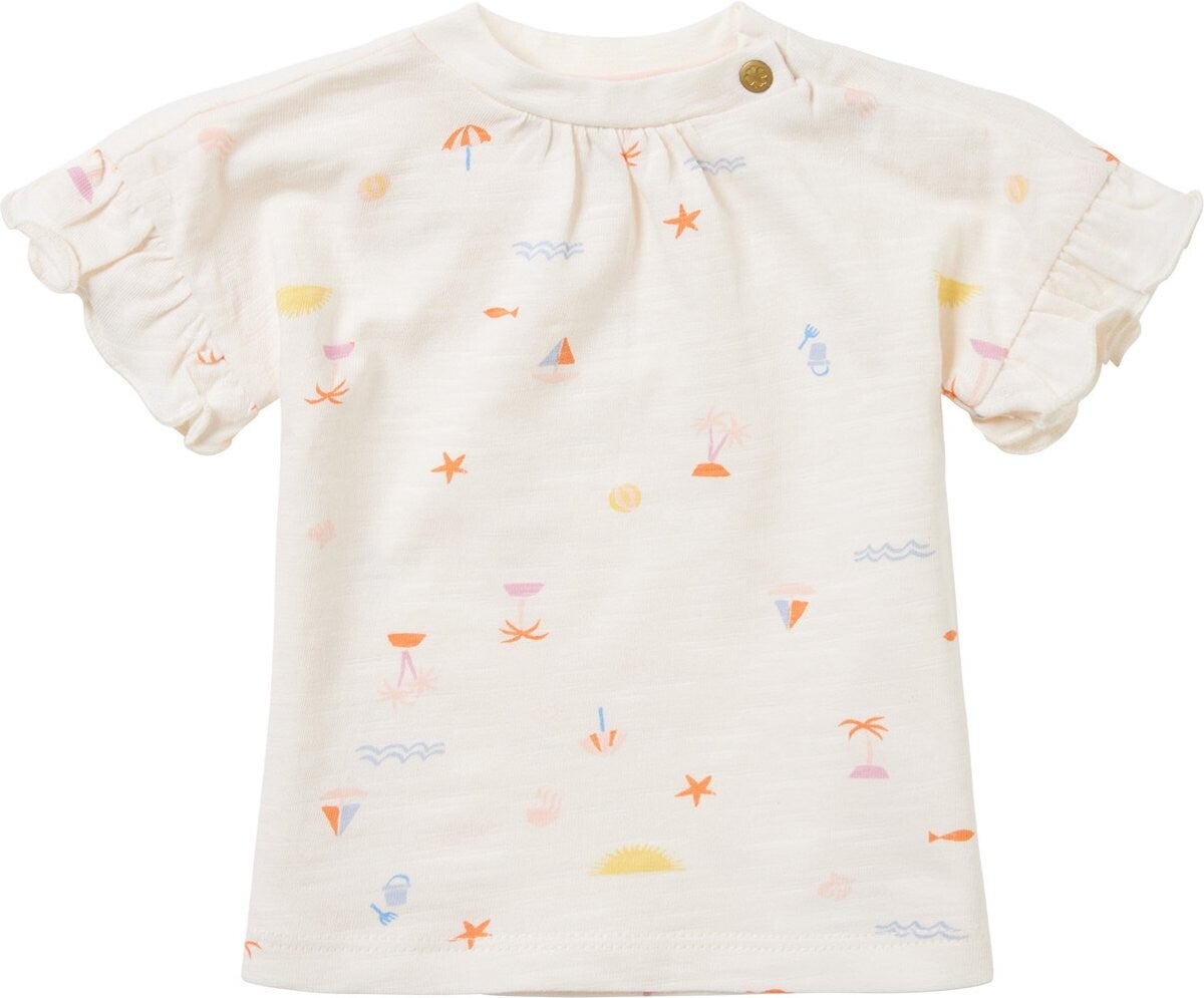 Palmbomen, zonnetjes, zeesterren en emmertjes ... je spot ze allemaal op dit leuke shirtje uit de Noppies Baby collectie. Shirt Delhi heeft een handig drukknoopje in de halslijn waardoor aan- en uitkleden een stuk makkelijker gaat. Het T-shirt heeft een allover printje, is lekker stretchy en heeft ruffelmouwtjes.