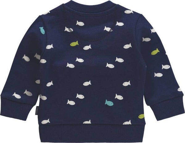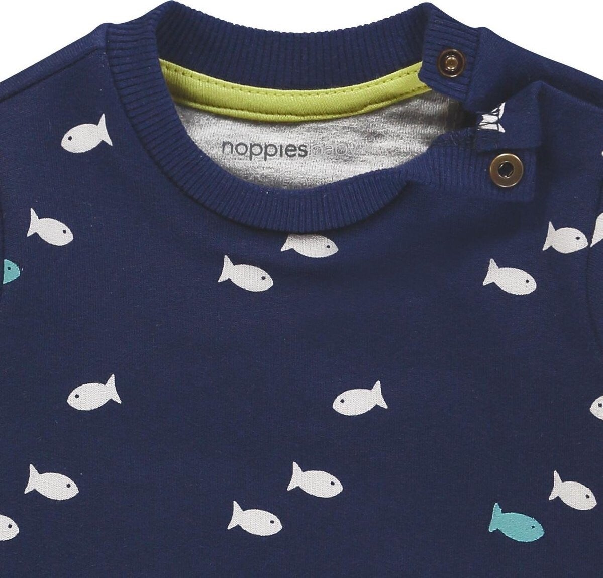 Sweater Reno van Noppies is gemaakt van zacht katoen met een speels dessin met visjes. De trui heeft een ronde halslijn met een drukknoopje, zodat het kledingstuk makkelijk over het hoofdje van je kindje gaat. Verder houden de ribgebreide boorden de sweater op zijn plek als jouw kleintje lekker gaat bewegen.
