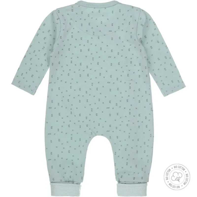 Dirkje unisex babypakje gemaakt van biologisch katoen. Dit pakje is cloud blue van kleur en bevat een all over print van misty green kruizen. De onderkant van het pakje heeft een omslagboord met een off-white met cloud blue gestreepte binnenkant.