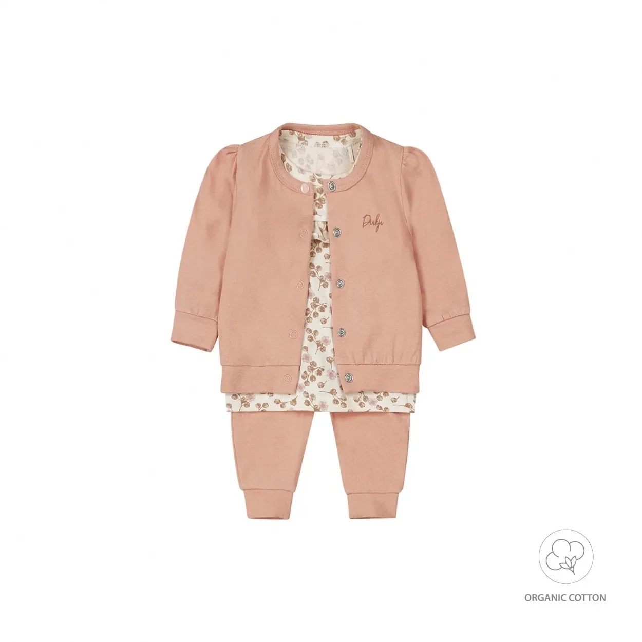Met liefde gemaakt, voor de allerkleinsten. Deze fijne set van Dirkje is gemaakt van een zachte organic cotton met stretch, extra comfortabel voor je meisje. De longsleeve is off white en heeft een lieve bloemetjes print in bruin en roze tinten. Het shirt met lange mouwen is voorzien van schattige ruffles op de voorzijde en heeft drukkers op de schouder. Het vestje heeft een klein pofmouwtje en wordt gesloten met drukkertjes op de voorkant. Dankzij de elastische boorden aan de onderkant van de broek blijven de pijpjes op hun plaats, waardoor de beentjes van je baby lekker warm blijven. Organic cotton babykleding is de ideale keuze voor ouders die het beste willen voor hun baby's. Gemaakt van biologisch geteelde katoen, is deze kleding zacht, comfortabel en veilig voor de gevoelige huid van baby's. Bovendien draagt het bij aan een gezondere planeet door duurzame en milieuvriendelijke teeltpraktijken. Kies voor bio katoen om je baby te verwennen en de wereld te beschermen.