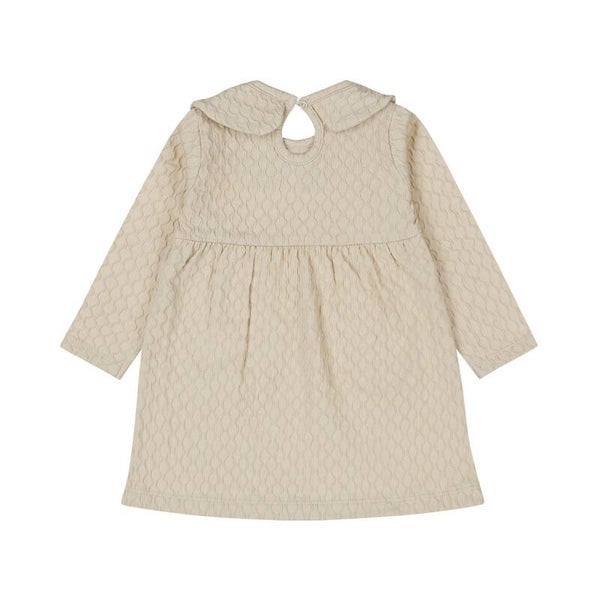 Maak het najaar extra charmant met deze prachtige Dirkje jurk! In een mooie beige grijze kleur en met een subtiel ingeweven patroon, is dit jurkje een stijlvolle keuze voor jouw kleintje. Het design met lange mouwen en een schattig kraagje maakt het perfect voor de koelere dagen. Het iets uitlopende rokgedeelte geeft de greige meisjes jurk een speelse look, terwijl het knoopje achter in de hals zorgt voor extra gemakt tijdens het aankleden.