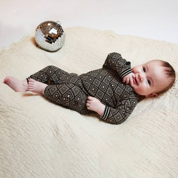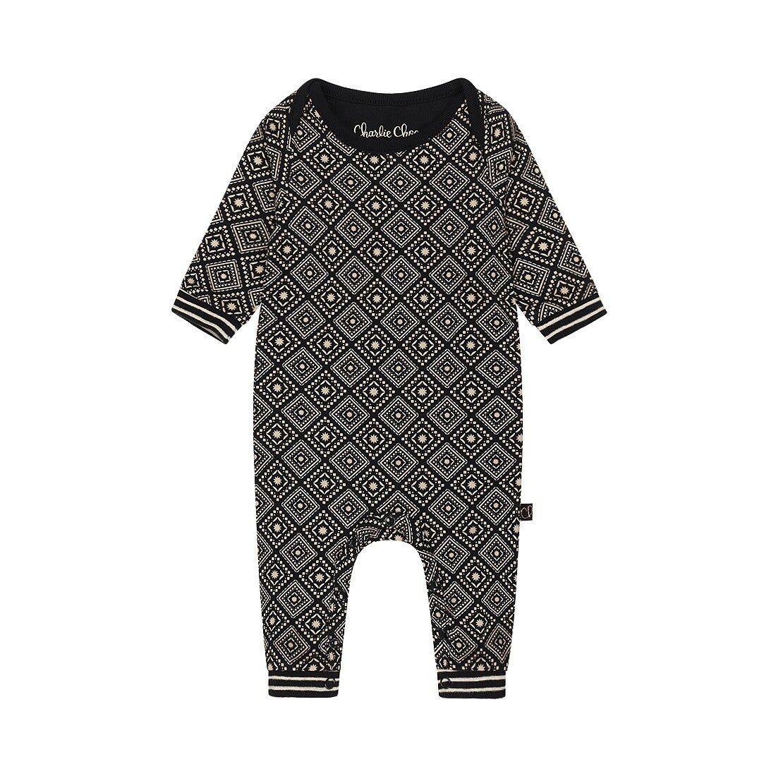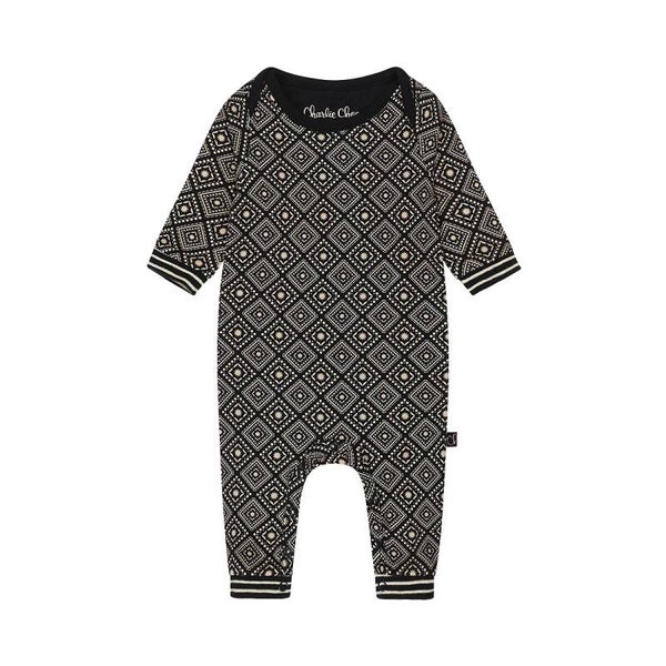 Wat een heerlijk baby--onesie met lange mouwen uit onze Charlie goes Retro-thema. Het zwarte katoenen Charlie Choe meisjespakje is zo fijn dat je je kleintje er de hele dag lekker in kunt knuffelen. Deze prachtige fantasie-checkprint is er voor het hele gezin!